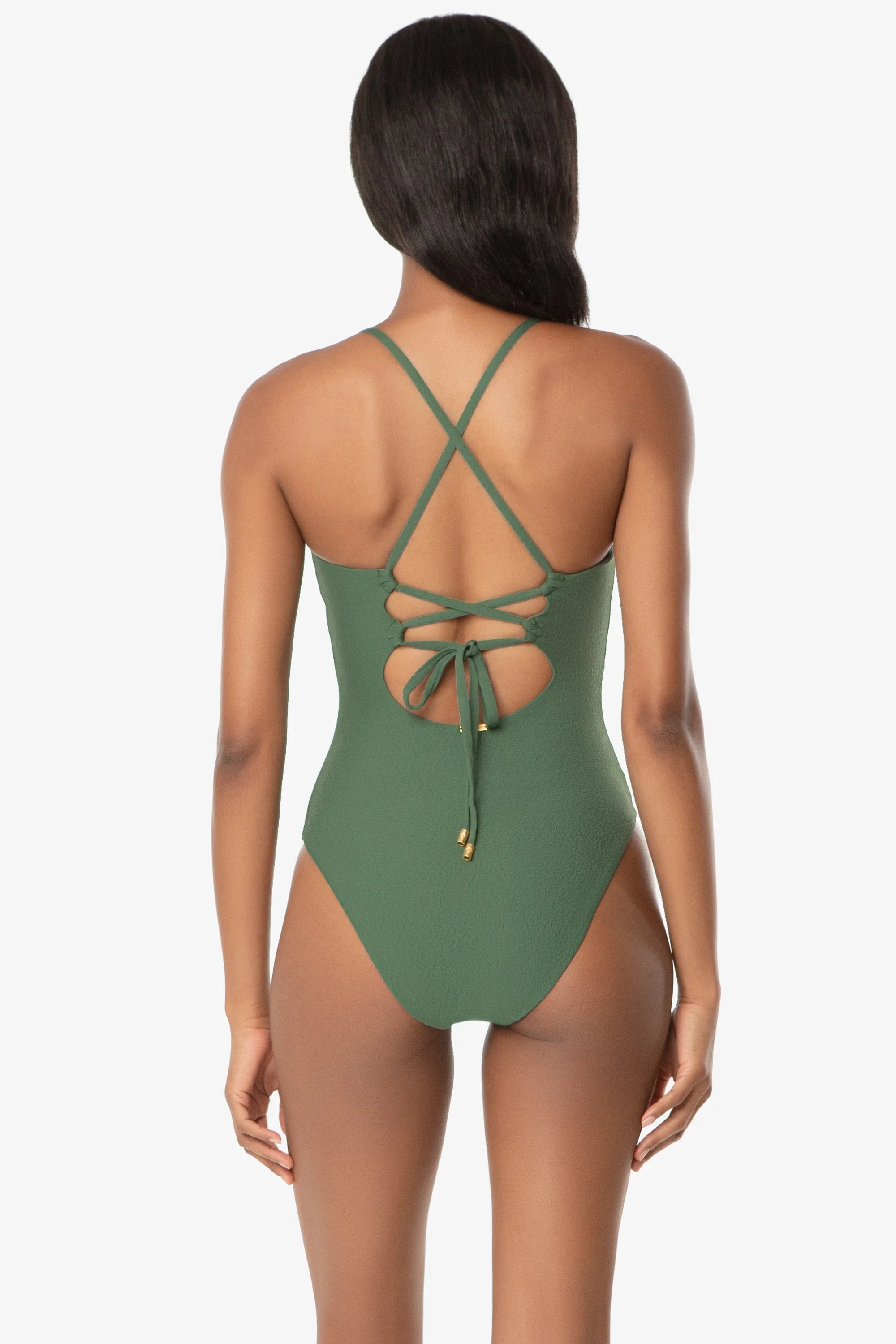 Inspired by chic ballet leotards, the ballet one-piece is the perfect compromise between stylish and modest. With sleek lines in the front and adjustable lace ties in the back, this swimsuit creates a beautiful silhouette that’s so flattering!