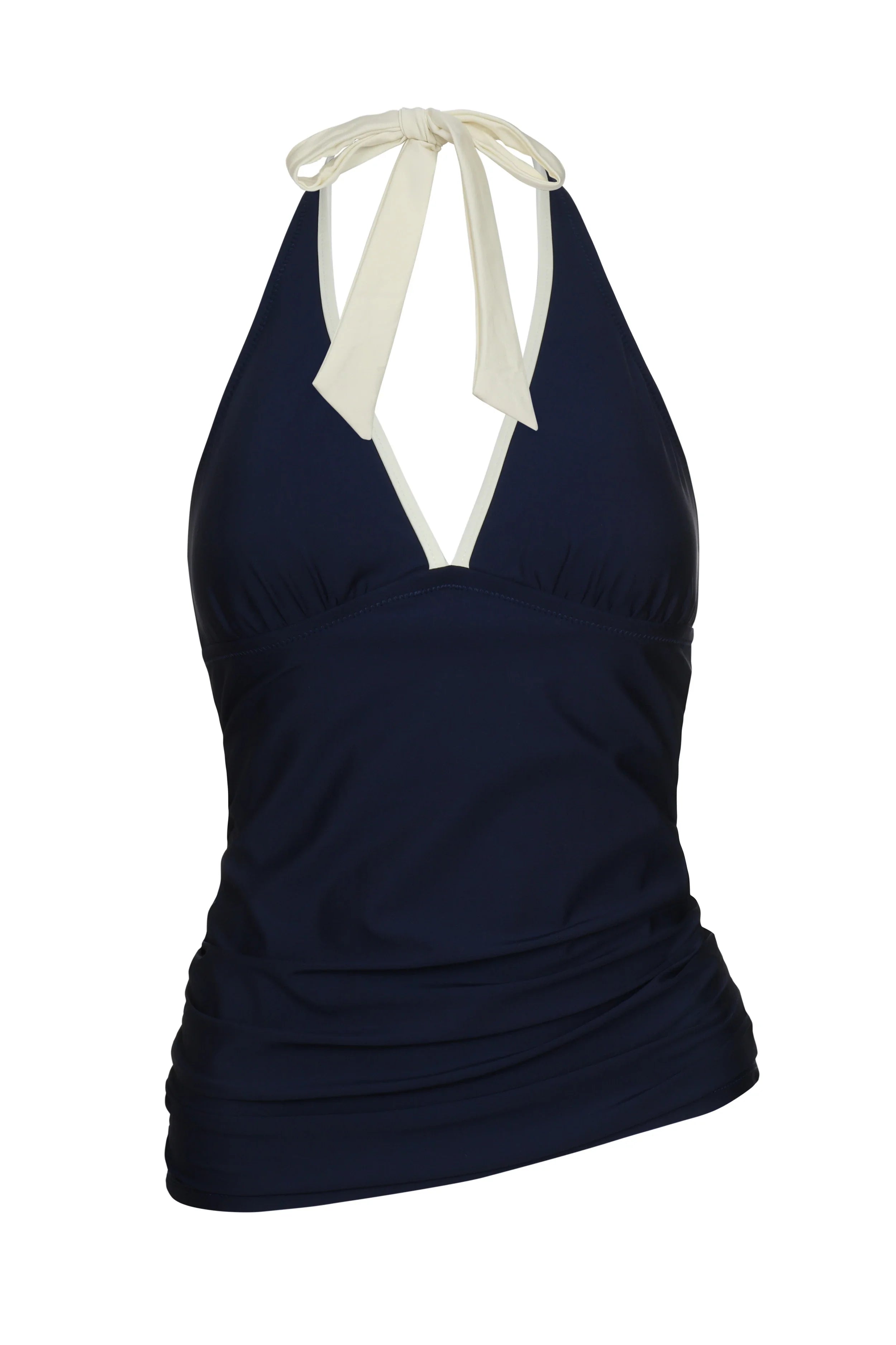 The classic halter silhouette gets a modern update with crisp binding details along the neckline. Navy and ivory create a nautical-inspired palette that's both timeless and fresh. This piece offers the support of a one-piece with the sun exposure of a bikini—the best of both worlds.