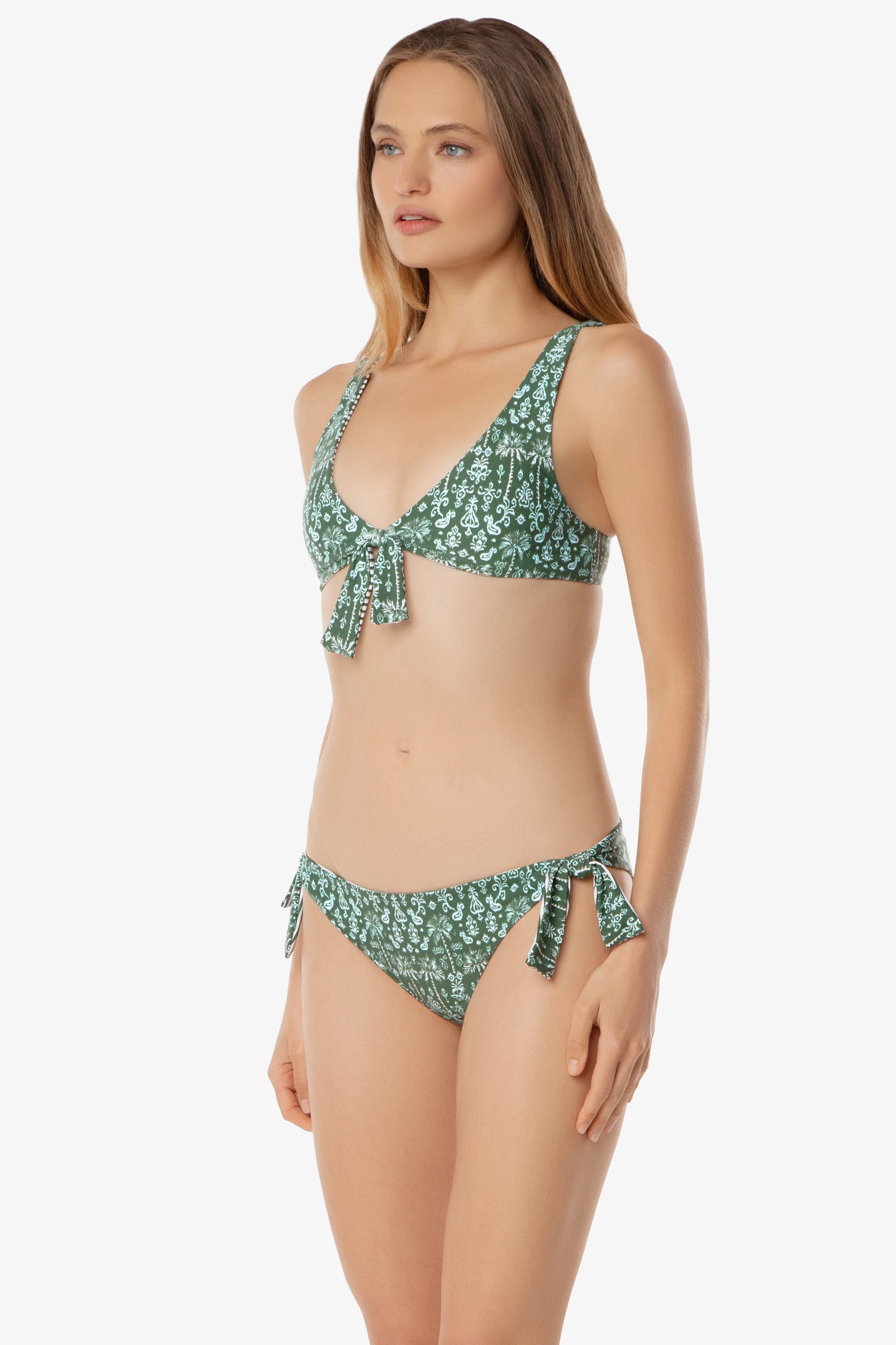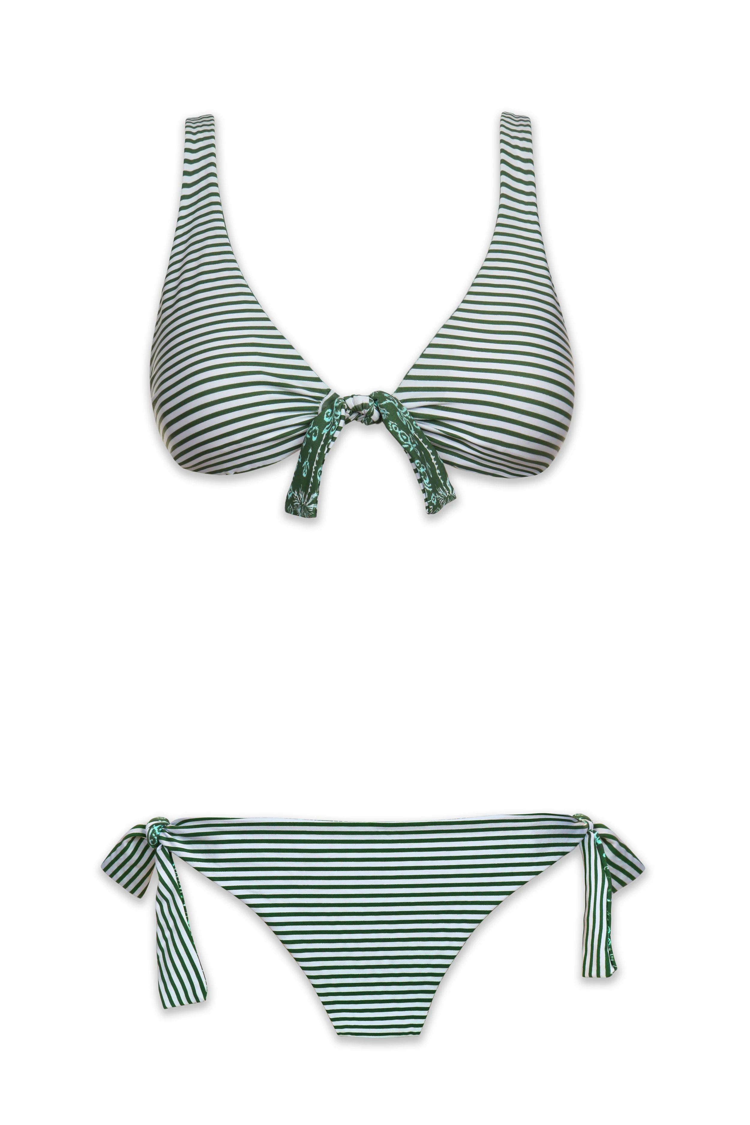 Inspired by the majestic tall trees of South America, our Salento print captures the essence of natural magnificence in two complementary patterns. The primary design features a lush fatigue green botanical motif with delicate floral elements reminiscent of forest canopies, while the reverse side showcases a clean, sophisticated stripe in the same earthy palette. This innovative double-sided print offers versatility, allowing for multiple styling options within a single piece. The organic patterns celebrate the beauty of Salento's natural landscape while providing a grounded, elegant resort aesthetic.